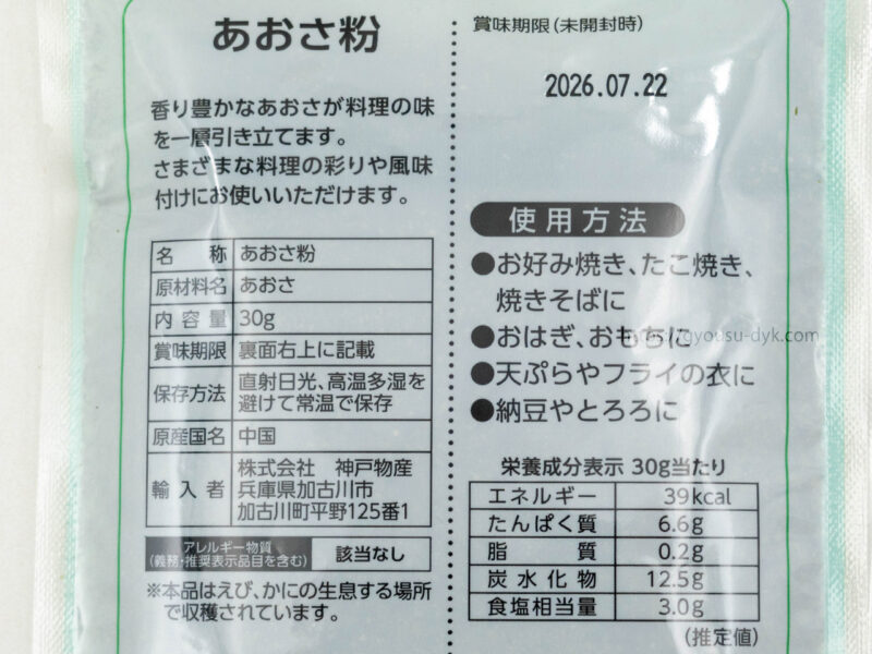 1袋85円(税別)の買いやすい価格ですが、ふわっと漂う磯の香りがありコスパ優秀!キッチンにストックしておくと非常に便利です。お好み焼きやたこ焼き、焼きそば、天ぷらなど様々な料理に使えます。