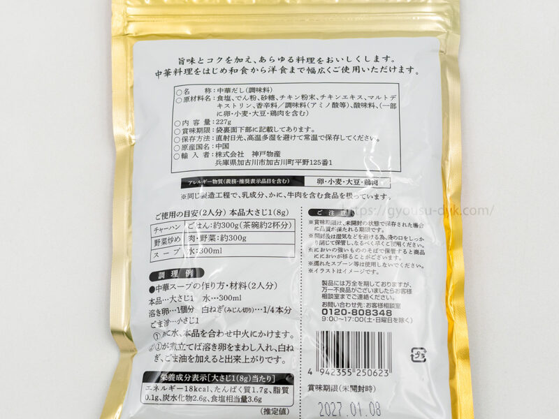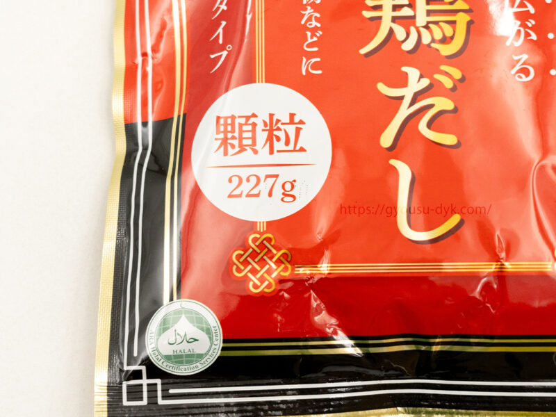 業務スーパーの「金の鶏だし」は、鶏だしベースの顆粒中華だしです。顆粒227gがジップ付き袋に入っています。
