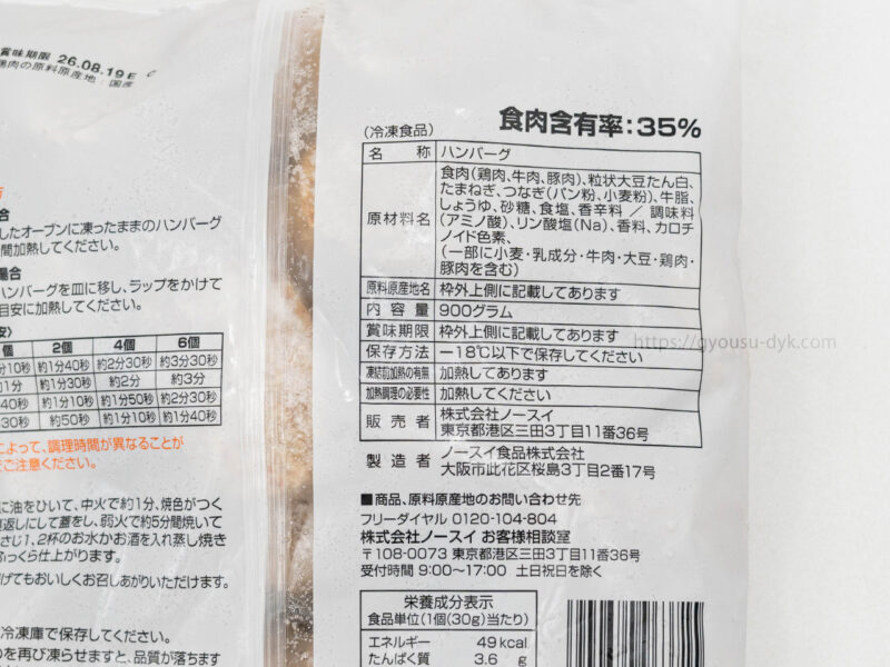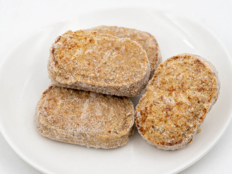 購入時(2025年10月)で1個あたり14.3円ほどになります。一般的なお弁当用の冷凍ハンバーグと比較すると、かなり安いと思います。