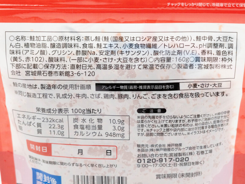 原材料は、蒸し鮭、鮭中骨、大豆たん白、植物油脂、食塩、醸造調味料、鮭エキスなどが入っています。カロリーは100gあたり232kcal(脂質11.0g、炭水化物10.9g)、カルシウムは100gあたり948㎎入っています。