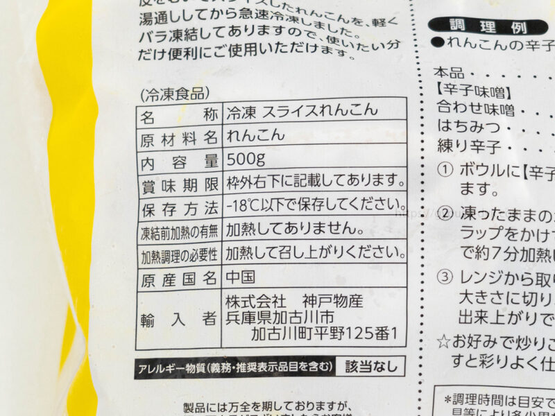 ■名称:冷凍スライスれんこん ■ 原材料名:れんこん ■内容量:500g ■保存方法:-18℃以下で保存してください。 ■原産国:中国 ■輸入者:株式会社神戸物産