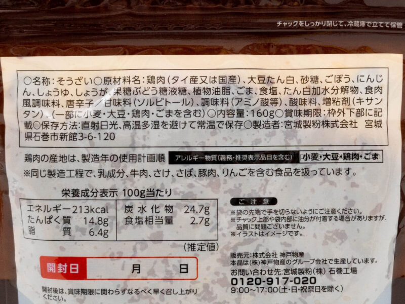 ■名称:そうざい■原材料:鶏肉(タイ産又は国産)、大豆たん白、砂糖、ごぼう、にんじん、しょうゆ、しょうが、果糖ぶどう糖液等、植物油脂、ごま、食塩、たん白加水分解物、食肉風味調味料、唐辛子/甘味料(ソルビトール)、調味料(アミノ酸等)、酸味料、増粘剤(キサンタン)、(一部に小麦・大豆・鶏肉・ごまを含む)■内容量:160g■保存方法:直射日光、高温多湿を避けて常温で保存■製造者:宮城製粉株式会社■発売元:株式会社神戸物産